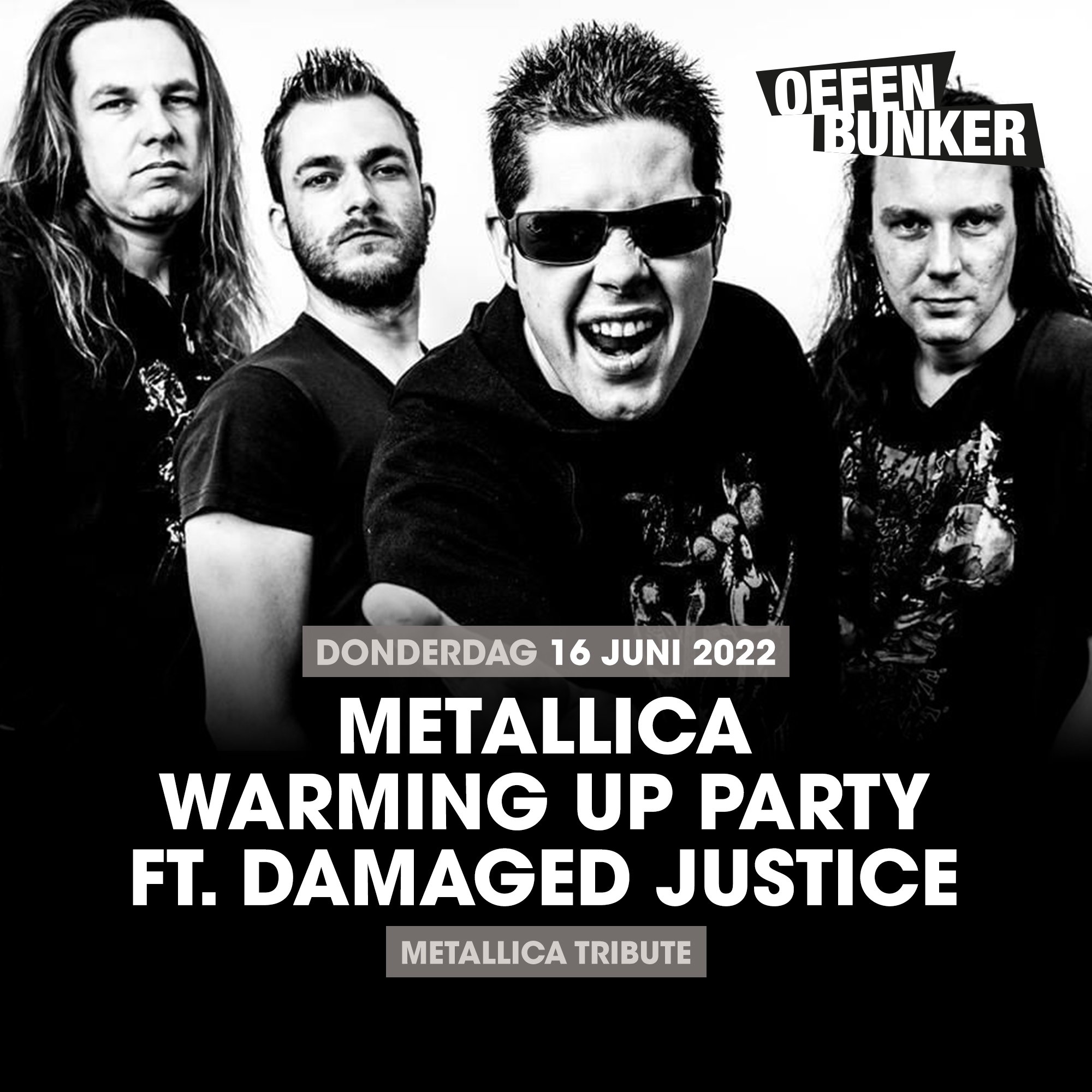 Vrijdag 17.06.2022 is Metallica de Headliner op Pinkpop vrijdag , om alvast in de stemming te komen organiseert de Oefenbunker i.s.m. HARDWIRED 2 the Netherlands Chapter 535 een Metallica Warming up party ft.: DAMAGED JUSTICE, op donderdag 16.06.2022 in de Oefenbunker te Landgraaf. Tickets zijn via de bekende kanalen van de Oefenbunker verkrijgbaar, maar let op vol is vol. De zaal gaat om 20.00 open en DAMAGED JUSTICE zal rond 21.00 uur het podium betreden om de aanwezige Metallica fans en bezoekers alvast in de stemming te brengen voor de dag erna.